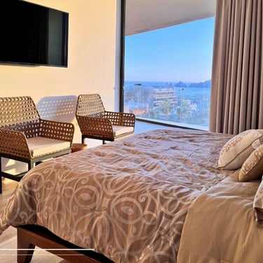 This spacious unit welcomes you with a bright open-concept layout, featuring marble-style travertine floors, a sleek modern kitchen with high-end stainless steel appliances, and a large living area that flows seamlessly to an expansive ocean-view terrace — ideal for relaxing or entertaining while enjoying the spectacular views of Land's End and the Cabo Bay.